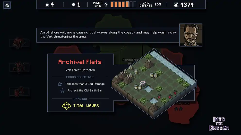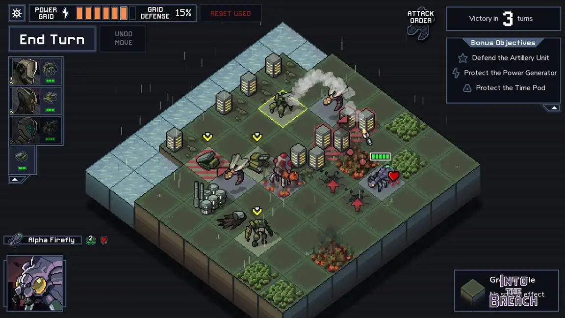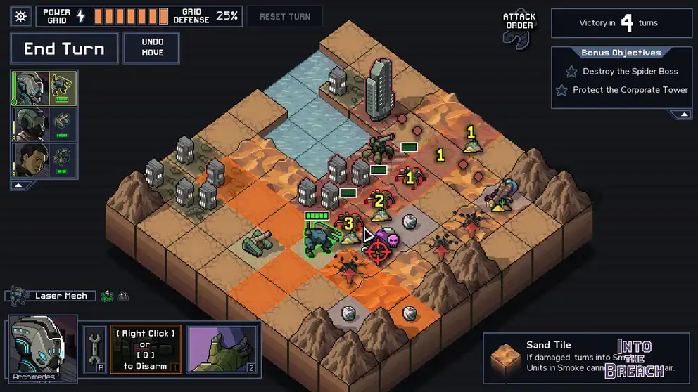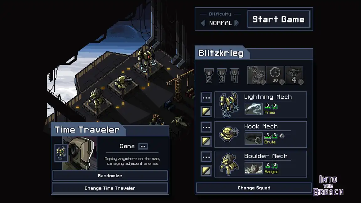 Civilization is under attack from a massive insectoid threat! In Into the Breach, you control powerful mechs from the future to defeat the Vek. Each turn is a tactical puzzle as you strategically position your units and use weapons to protect the cities.