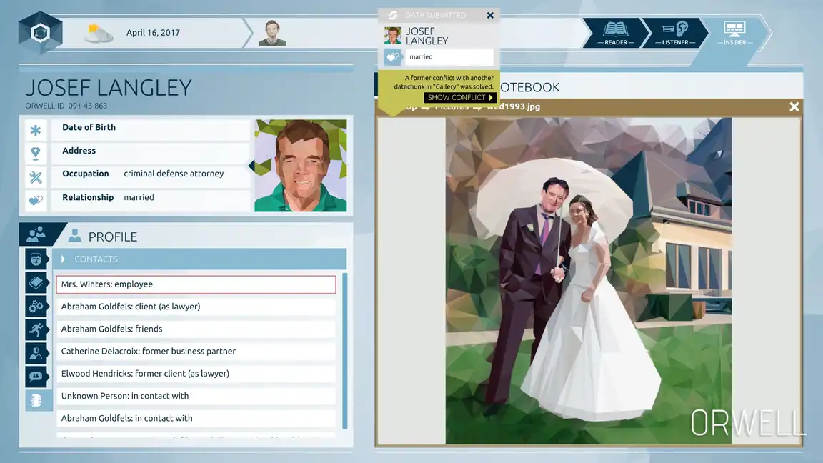 В Orwell: Keeping an Eye On You вы становитесь сотрудником секретной службы. Ваша задача — следить за гражданами, анализировать их данные и предотвращать преступления. Каждое решение имеет последствия.