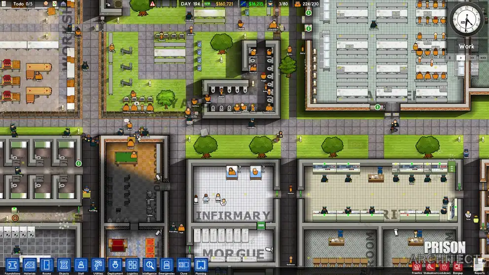 В Prison Architect вам предстоит не просто строить тюрьму, а управлять ею, решая вопросы безопасности, инфраструктуры и благополучия заключенных. Продумывайте планировку камер, столовых и дворов, нанимайте персонал и следите за порядком, чтобы предотвратить бунты и побеги. Это сложная стратегия, где важна каждая деталь.