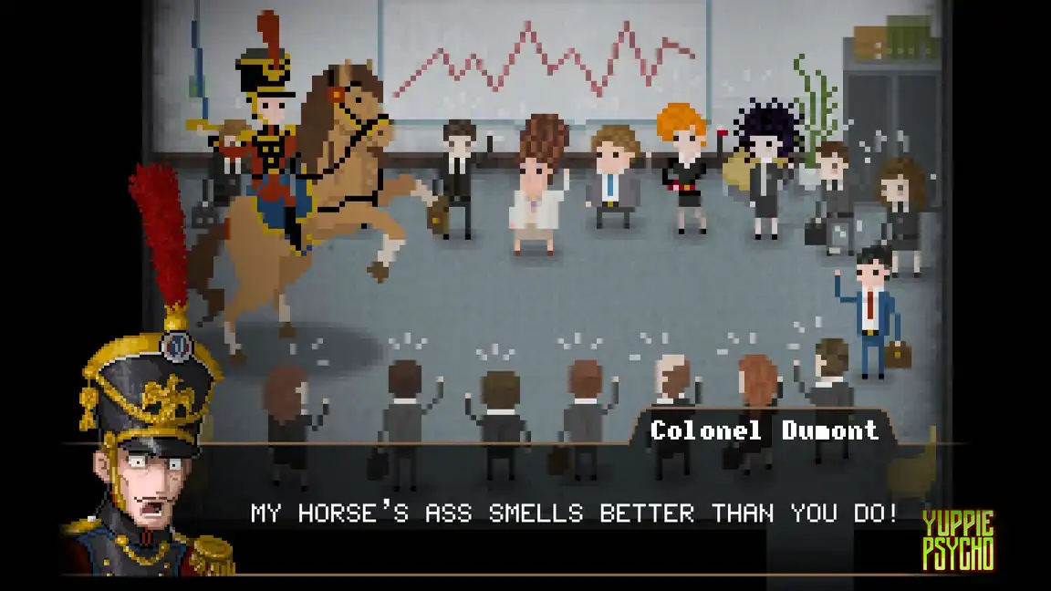 В Yuppie Psycho ты — новичок Брайан Пастернак, устраивающийся в корпорацию Sintracorp. Мечты о лучшей жизни быстро разбиваются о кошмарный мир офисной рутины, где приходится выживать любой ценой.